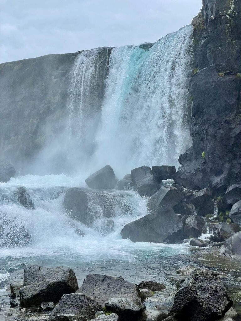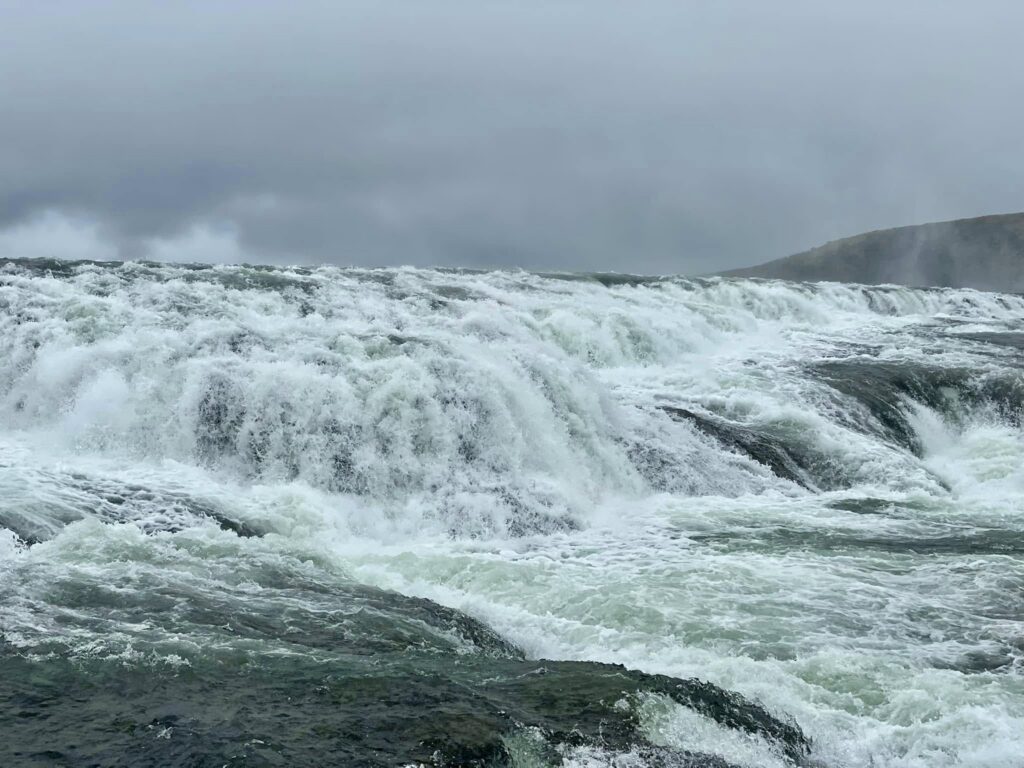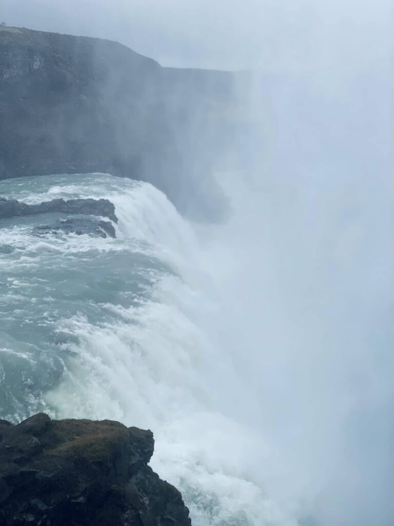 Last stop for the day was the awe inspiring thunderous Gullfoss, a massive “Golden Falls” thundering two-tiered waterfall that plunges a total of 32 meters into a deep, narrow canyon of the Hvítá River. Fed by the Langjökull glacier, the falls are famous for the golden-brown hue the water takes on as it carries glacial sediment, often producing vivid rainbows in the heavy mist on sunny days. Beyond its geological grandeur, Gullfoss holds a significant place in Icelandic history as the site of the country’s first major environmental battle in the early 20th century; Sigríður Tómasdóttir, the daughter of the local landowner, famously fought a decades-long legal battle—even threatening to throw herself into the falls—to prevent foreign investors from damming the river for a hydroelectric plant. Her successful protest preserved the site for future generations, and today a memorial stands near the falls to honor her as Iceland’s first environmentalist.