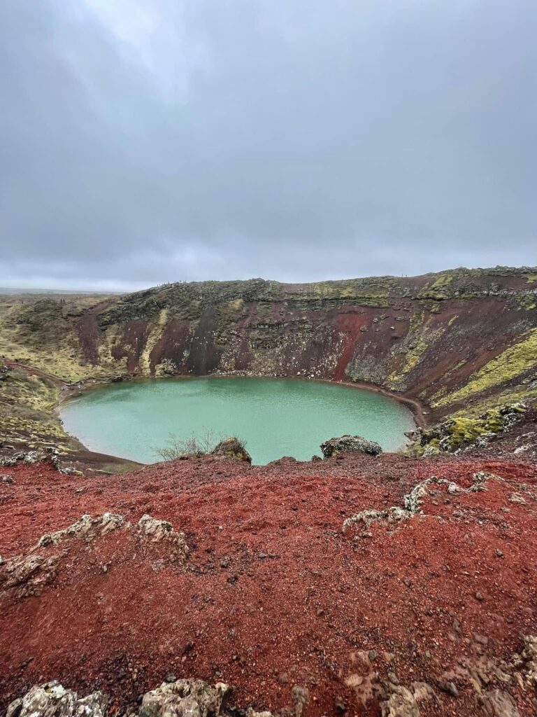 Next stop for us was the Kerið (Kerid) Volcanic Crater. Formed approximately 3,000 to 6,500 years ago, Kerið is a volcanic caldera located in the Grímsnes area of South Iceland, frequently visited as a scenic addition to the Golden Circle route. Unlike many of Iceland’s black volcanic landscapes, Kerið is famous for its steep, rust-red slopes—a result of relatively young iron-rich lava that has not yet fully oxidized. The crater, which measures 55 meters deep and 270 meters across, houses a vivid teal lake that is uniquely fed by the groundwater table rather than rainfall, meaning the water level rises and falls in sync with the surrounding earth. Historically, the caldera was not formed by an explosion but by a cone volcano that emptied its magma chamber and collapsed inward, creating a natural amphitheater so acoustically perfect that musicians have occasionally used floating platforms on the lake for concerts