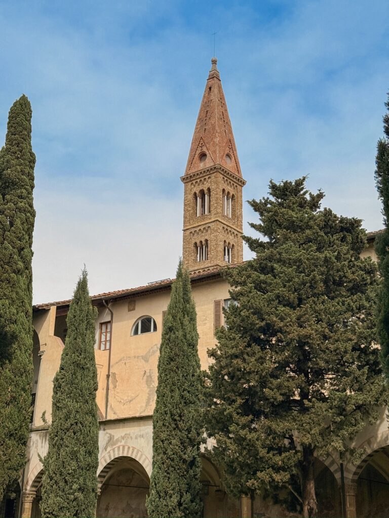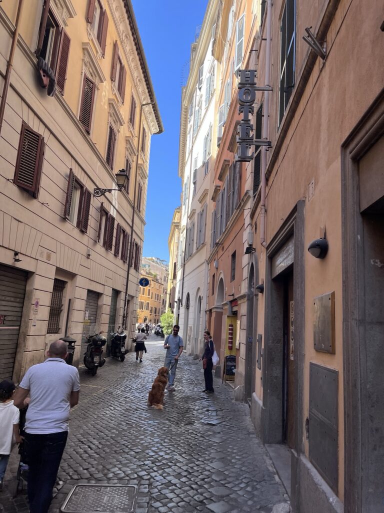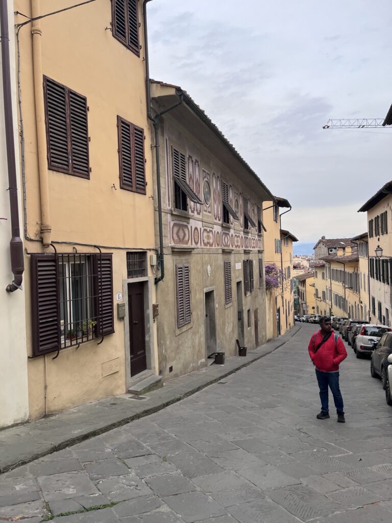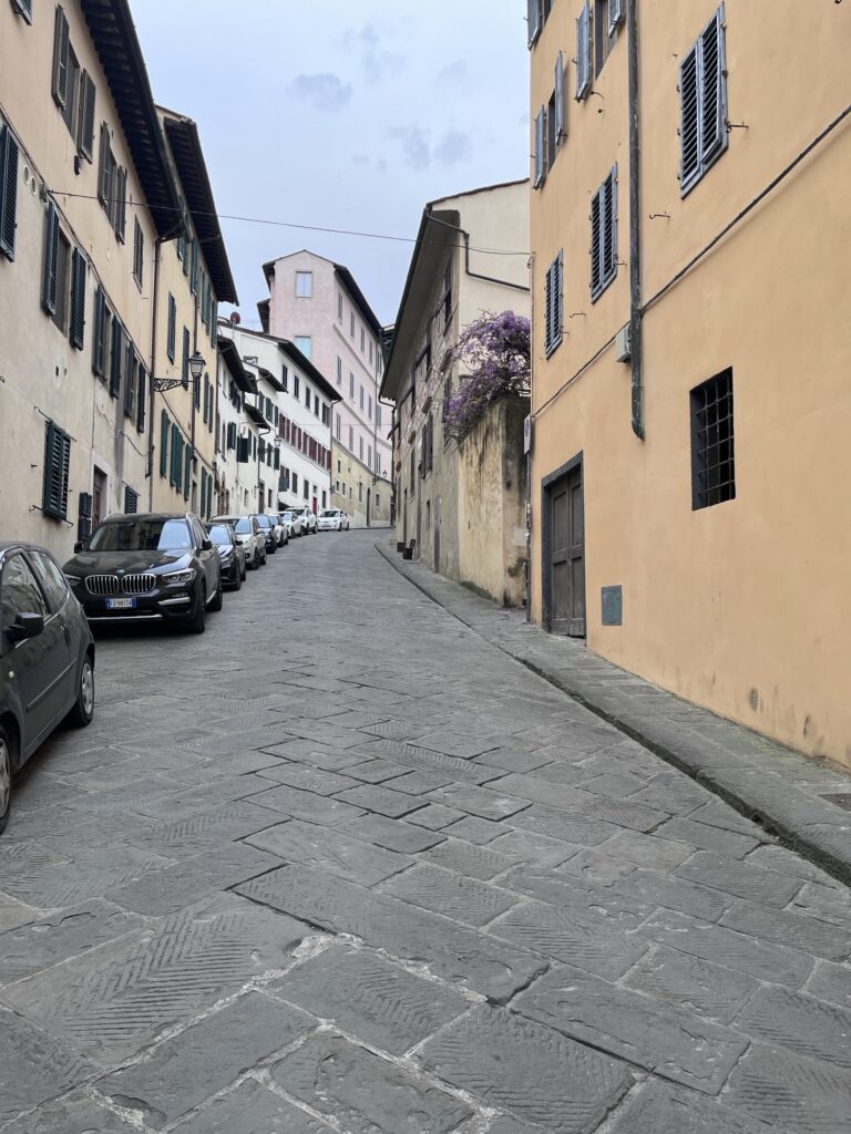 Reviews for our Air BnB warned that it was up a steep hill, so we took a taxi to reach it. Riding a taxi through the Sunday crowds on narrow one-way streets was certainly an experience! We crossed a bridge to the other side of the river, then due to the one way streets had to take a convoluted route past Palazzo Pitti to wind up the hill and come back down from the top. I don’t think the taxi driver was playing us, there really was no simple way to get there. As we got out of the taxi, we were glad for our choice. It was a steep slope! Wheeling suitcases up would have been no fun at all.