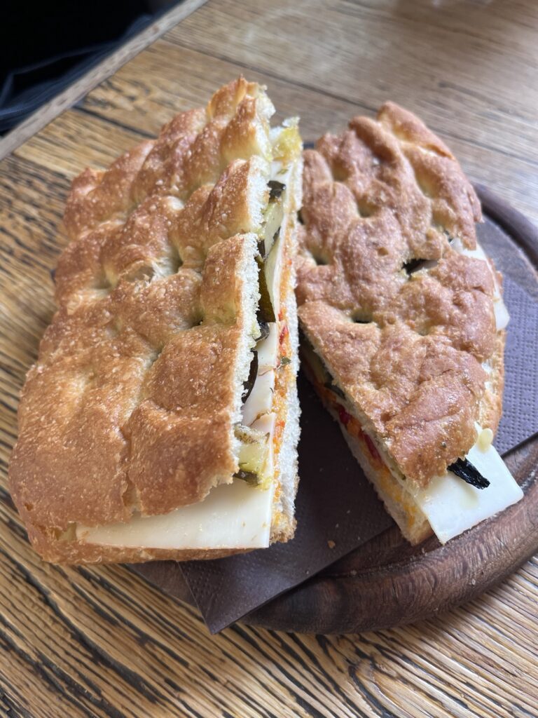 Lunch was a perfect example of this. We stopped at a little shop called La Boite. The shop was located on a small piazza in a stone building that simultaneously felt old and new. The schiacciate (sandwich) menu was a line up of sandwiches named after celebrities – Mervin had a Denzel Washington and I had a Bob Dylan. There was a mix of locals and tourists and the staff switched between Italian and English seamlessly.
