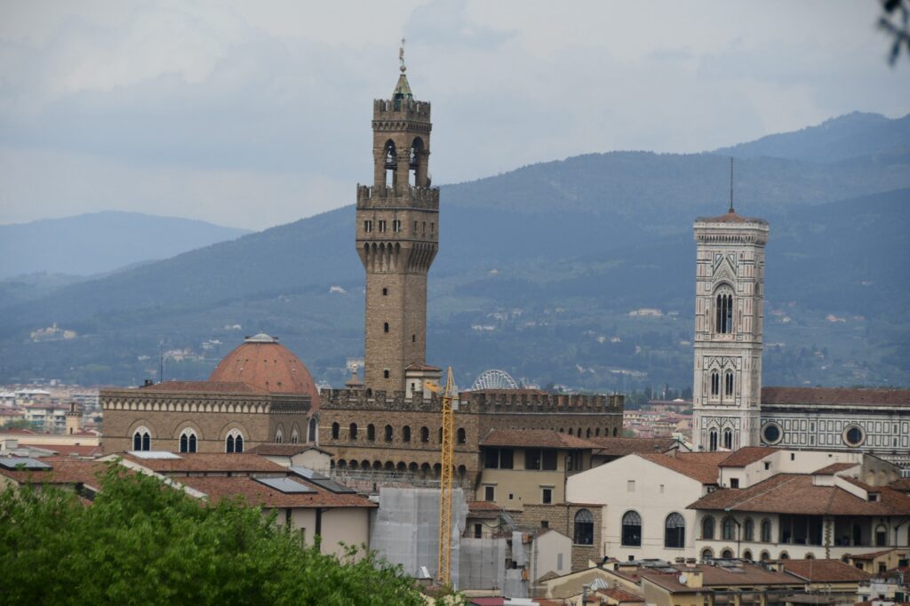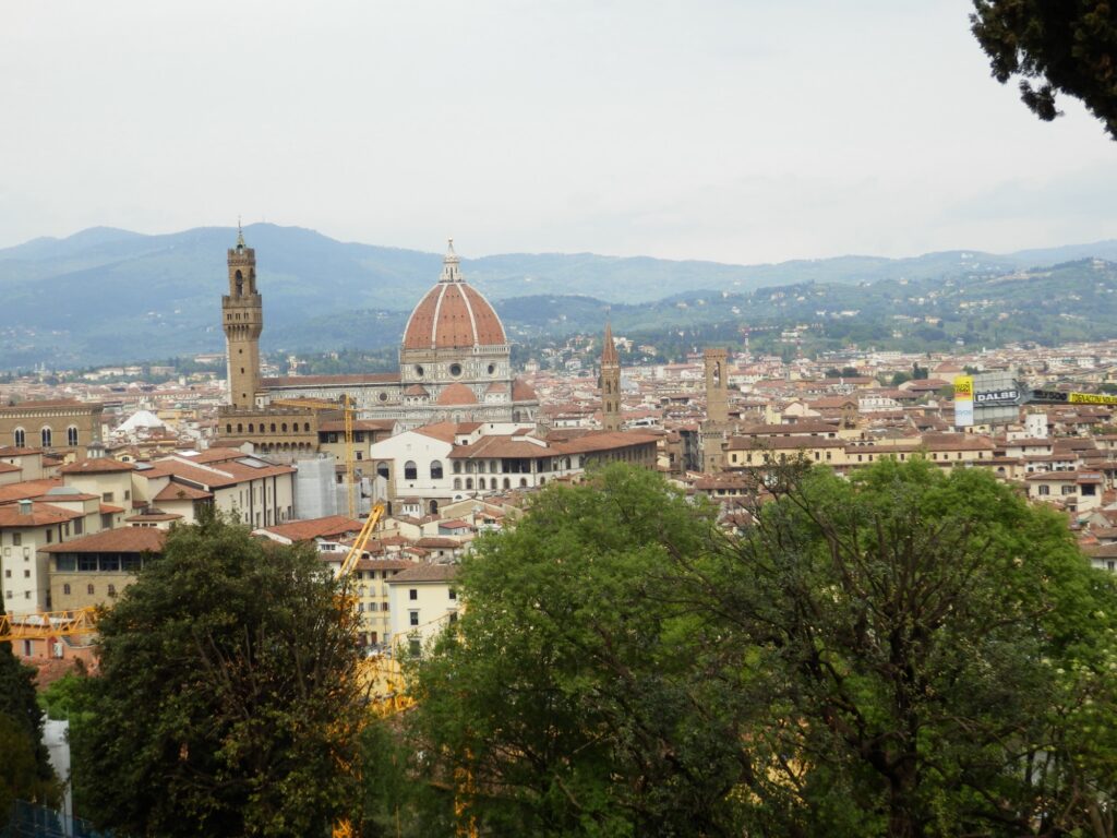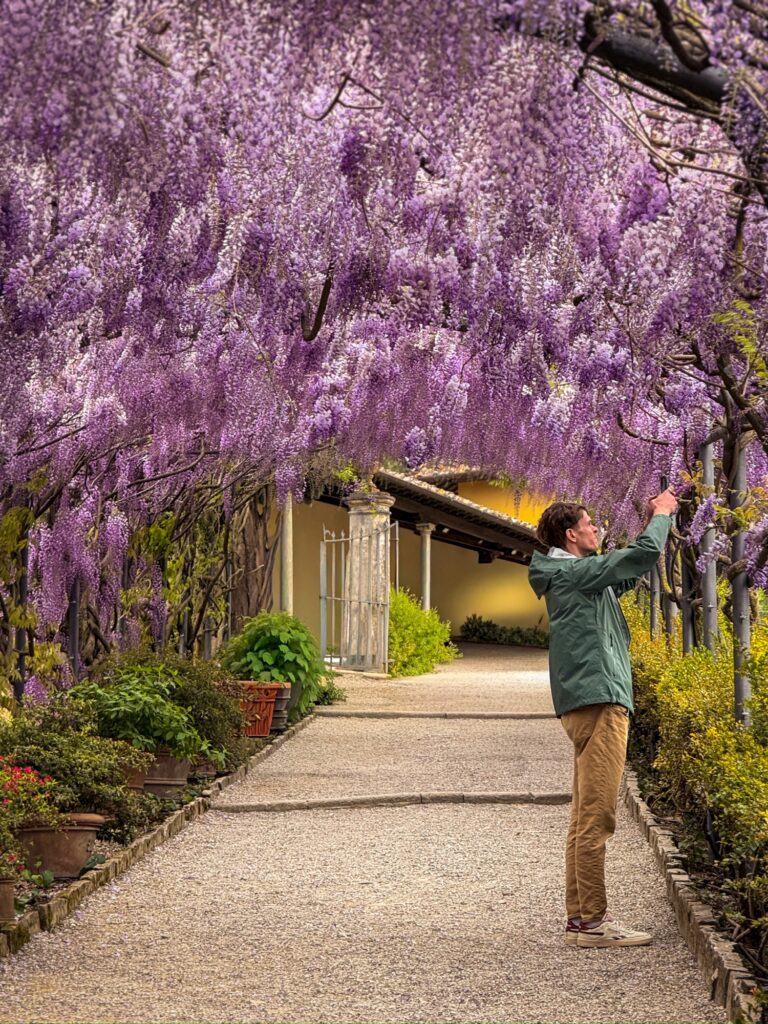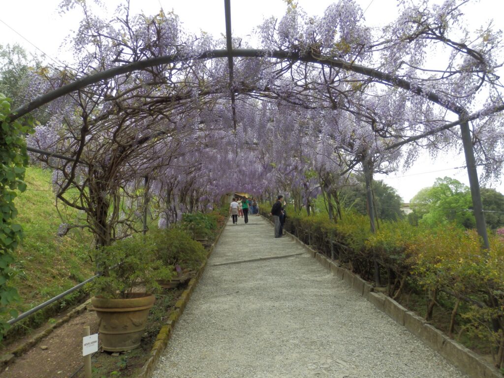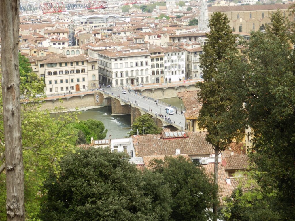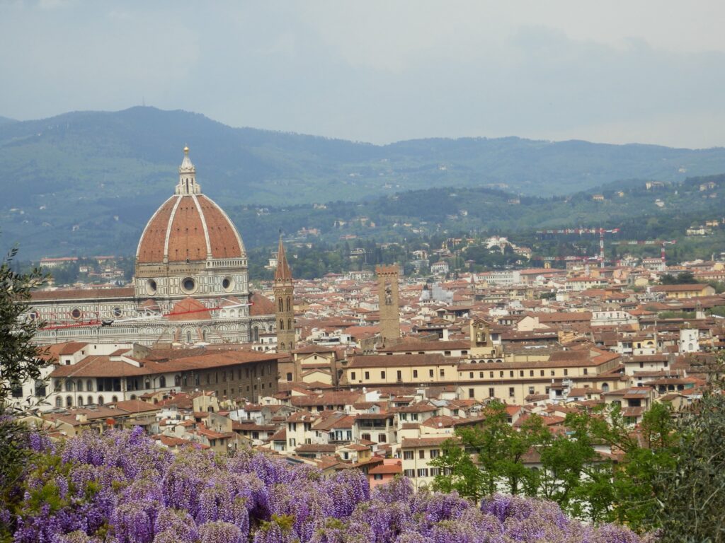 To get back to our Air BnB, we crossed over the Ponte alle Grazie bridge which gave us a great view down the river back toward Ponte Vecchio. Even from this distance we could see the crowds now packing the open point between the shops to take photos. Since we had to climb back up the hill to our Air BnB anyway, we decided to do so through the Bardini Garden. That proved to be one of the best decisions of the day. While it was a steady climb uphill, the switchbacks were fairly gentle and manageable. The views were incredible. As we gained height more and more of the city came into view, until at the top we had a nearly full panorama. The wisteria trellis at the top was in full bloom, and we sat on a hill above it for a while enjoying the cityscape framed by purple blossoms. From the exit of the garden it was just a 2 minutes walk downhill to our stay.