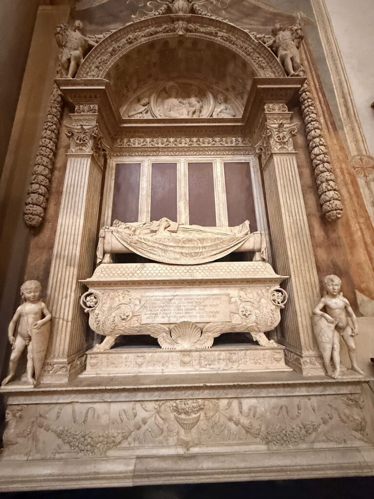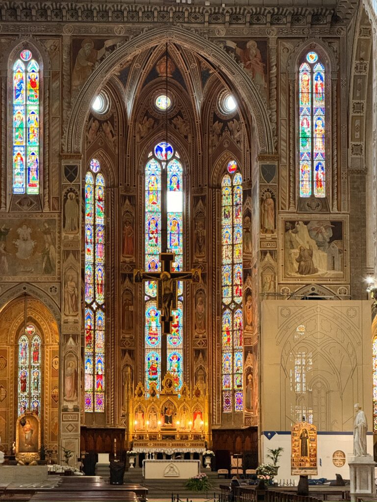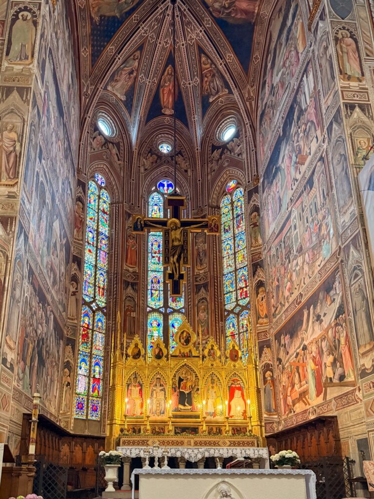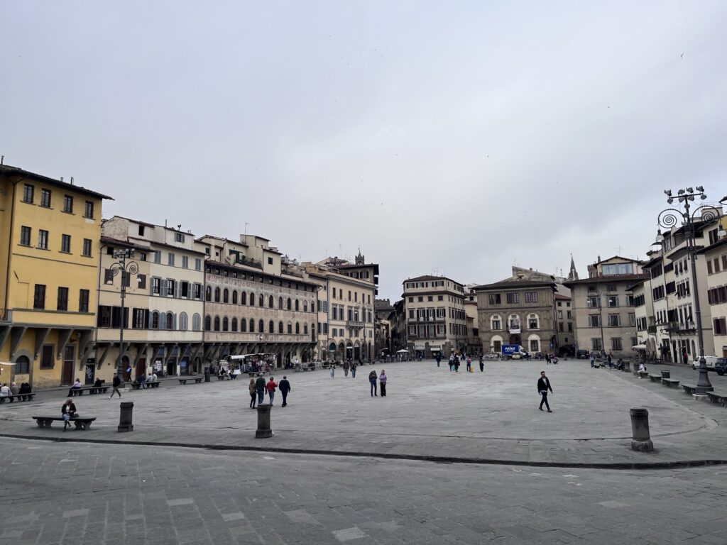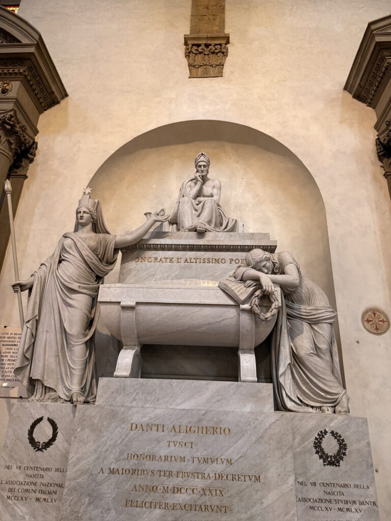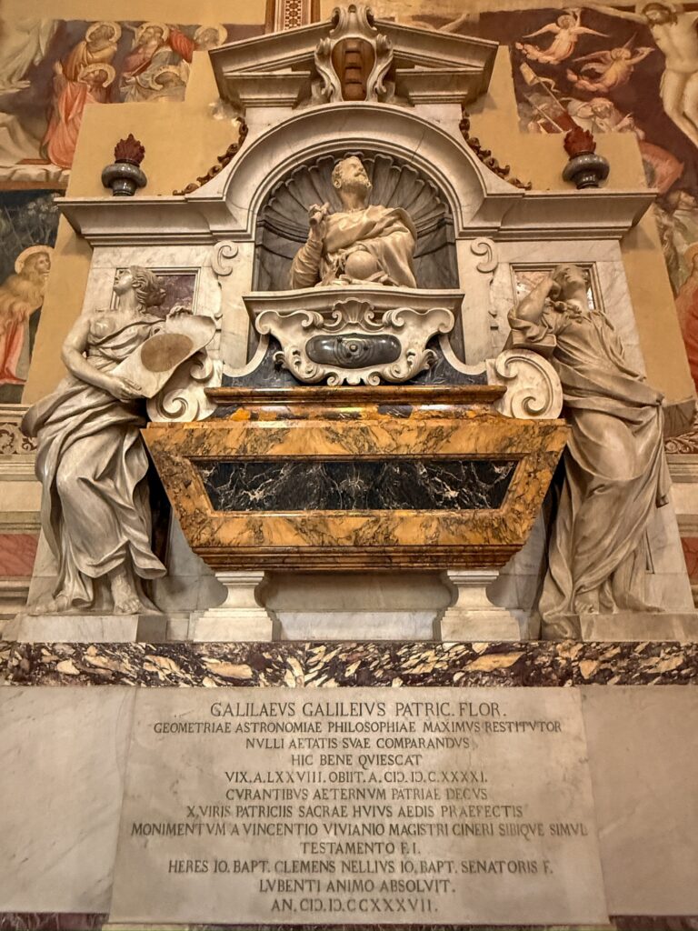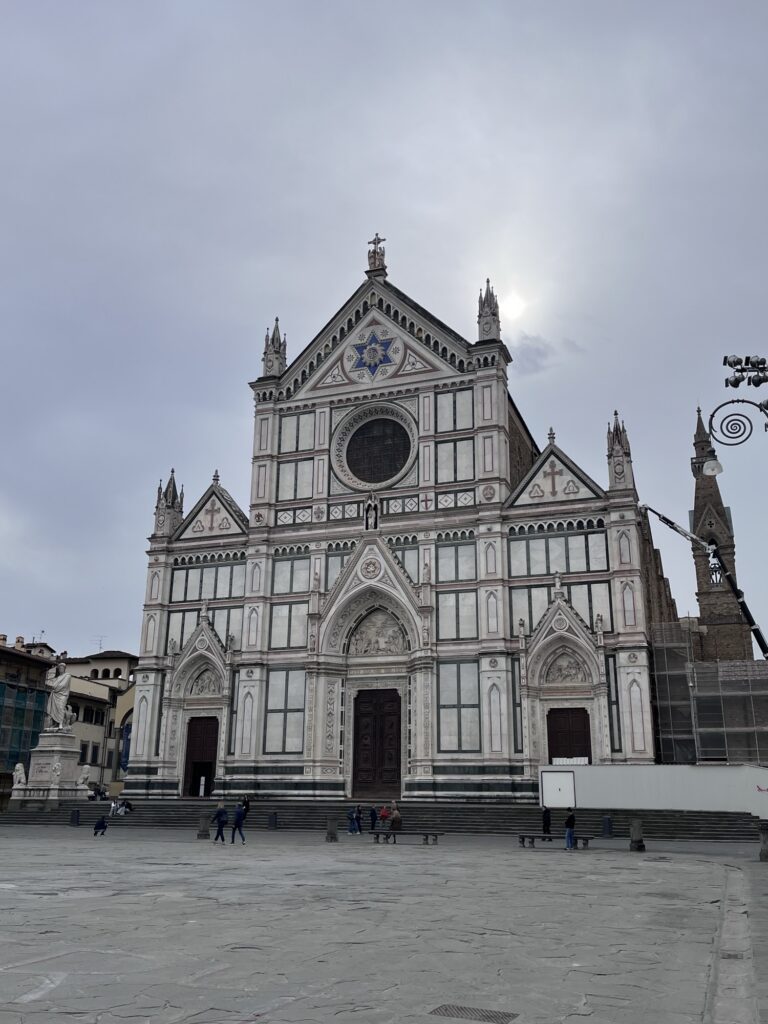 It was still early for the Duomo when we finished, so instead we walked a few more blocks over to the Basilica of Santa Croce which was just opening up. This large complex is located along the river in what was once marshland beyond the city walls. It is the burial place of many famous Renaissance figures, including Michelangelo, Galileo, and Machiavelli. It is also the largest Franciscan church in the world. Beyond the church, we were able to explore chapels, museum exhibits, the cloisters, and gardens. One exhibit showed the history of frequent flooding throughout the churche’s history, often reaching well over 12 feet and damaging or destroying the precious art inside. In the most recent round of flooding in the 1960s before modern river controls were put in place, many pieces of art were taken up the hill to near Boboli garden to dry out and be restored.