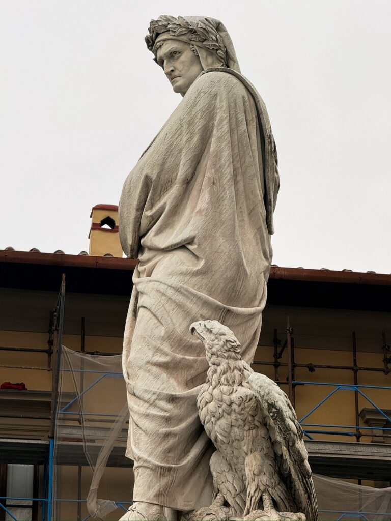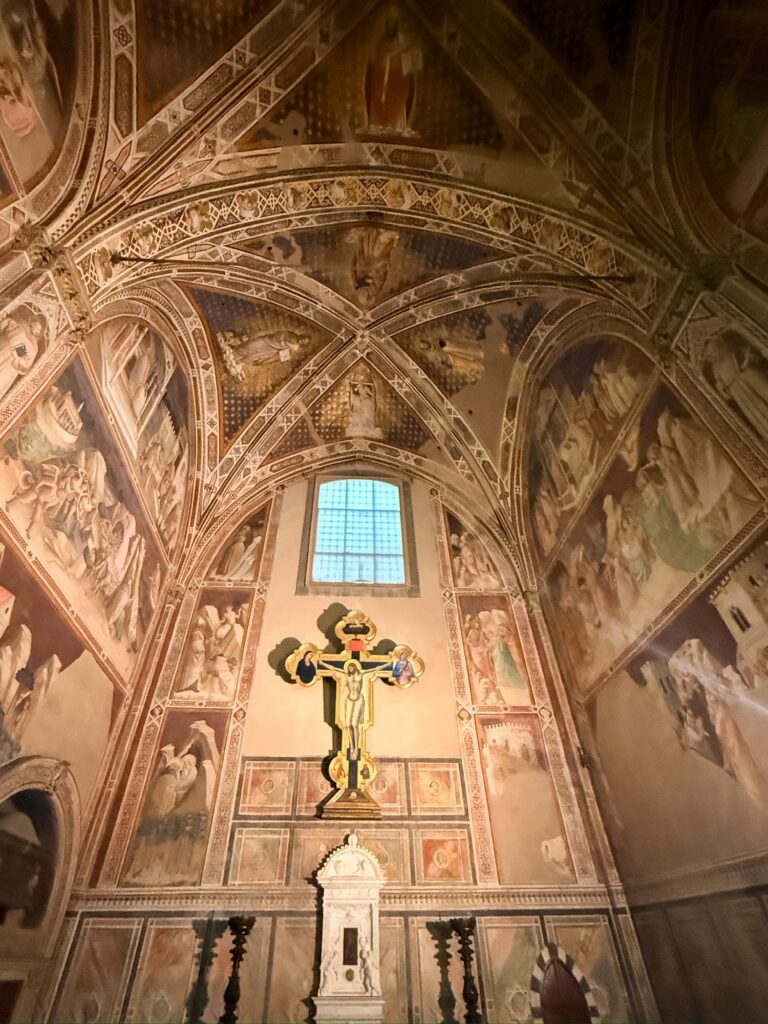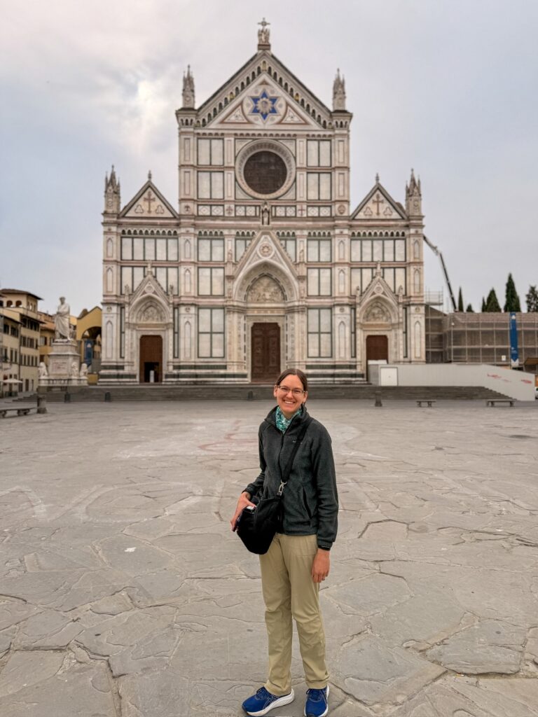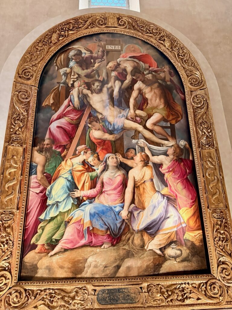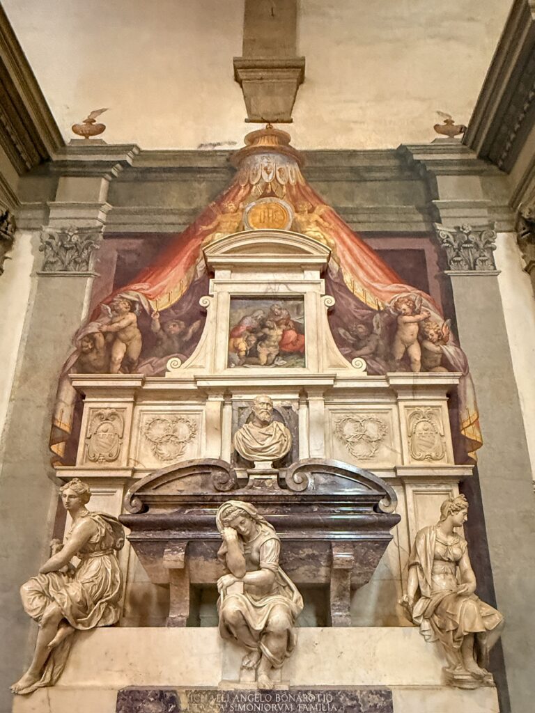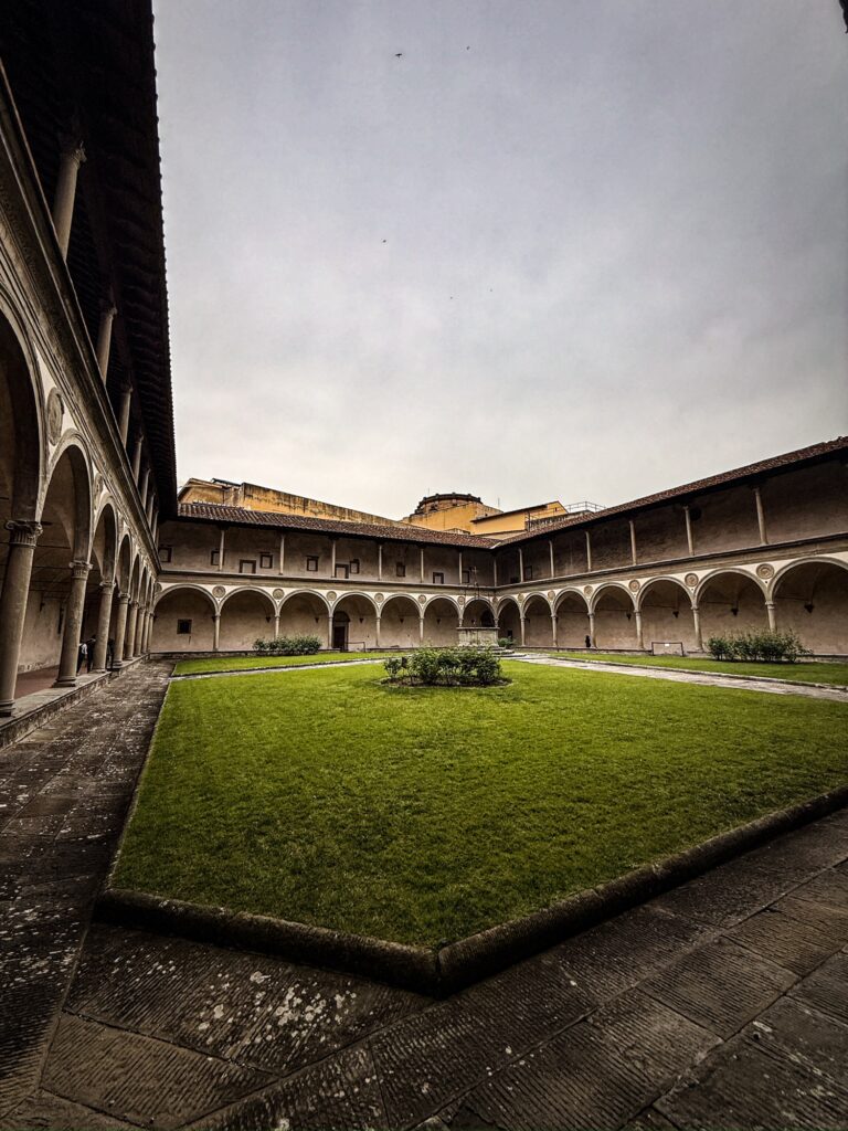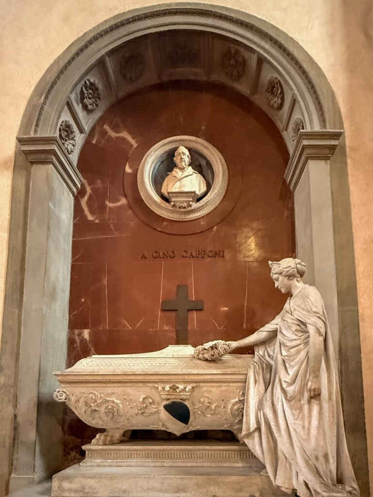 It was still early for the Duomo when we finished, so instead we walked a few more blocks over to the Basilica of Santa Croce which was just opening up. This large complex is located along the river in what was once marshland beyond the city walls. It is the burial place of many famous Renaissance figures, including Michelangelo, Galileo, and Machiavelli. It is also the largest Franciscan church in the world. Beyond the church, we were able to explore chapels, museum exhibits, the cloisters, and gardens. One exhibit showed the history of frequent flooding throughout the churche’s history, often reaching well over 12 feet and damaging or destroying the precious art inside. In the most recent round of flooding in the 1960s before modern river controls were put in place, many pieces of art were taken up the hill to near Boboli garden to dry out and be restored.