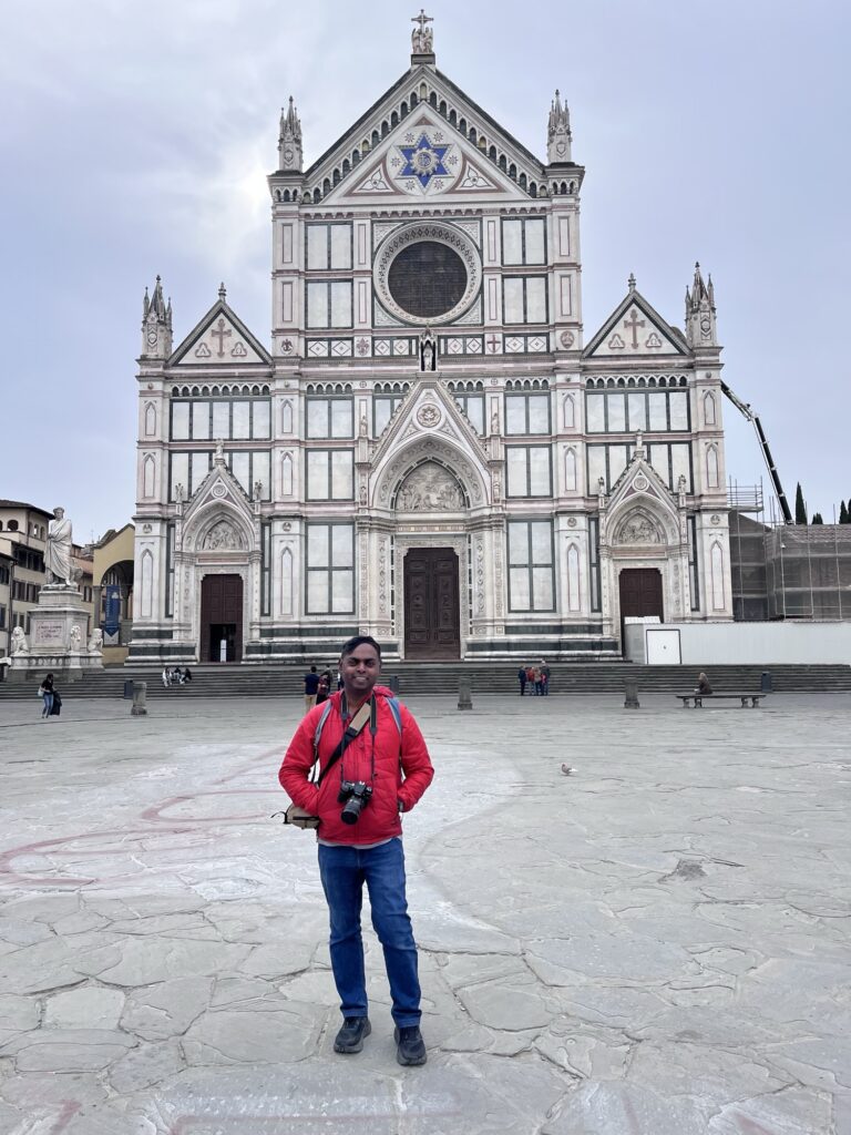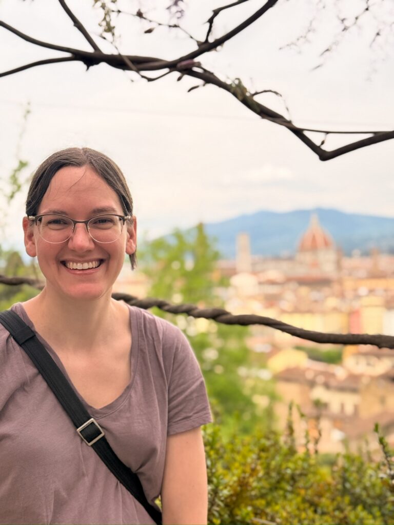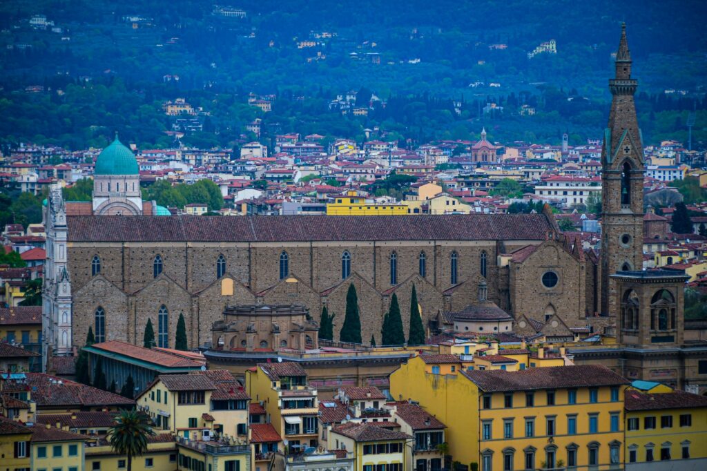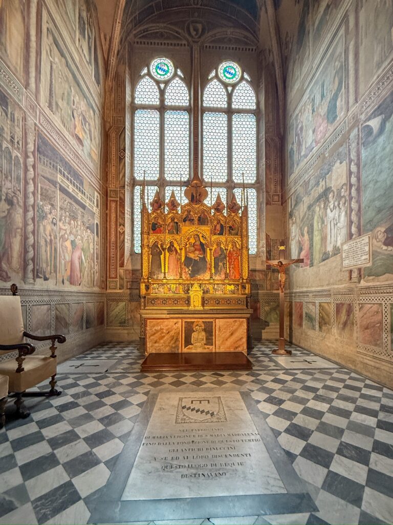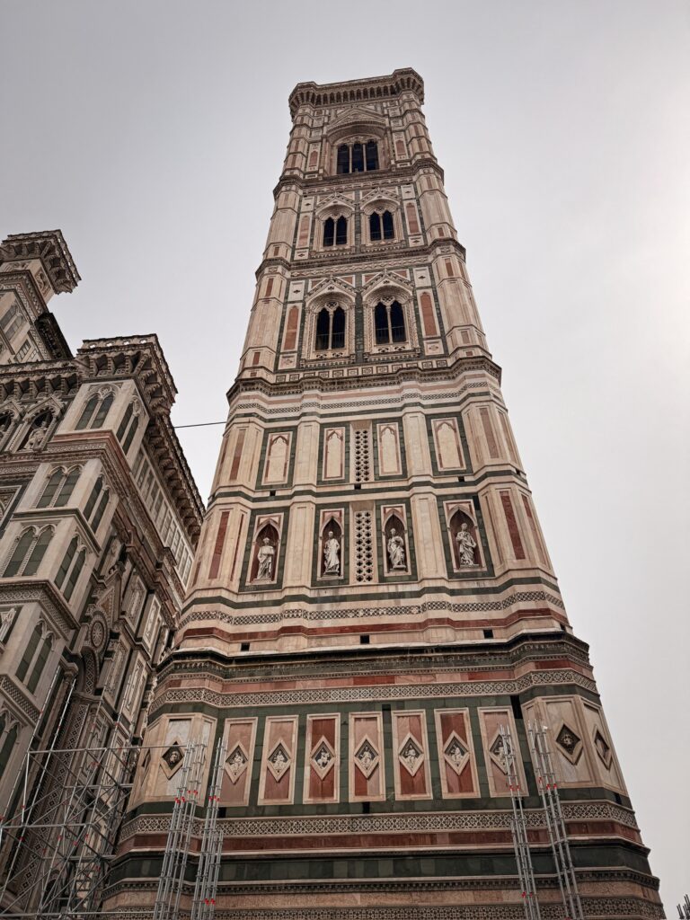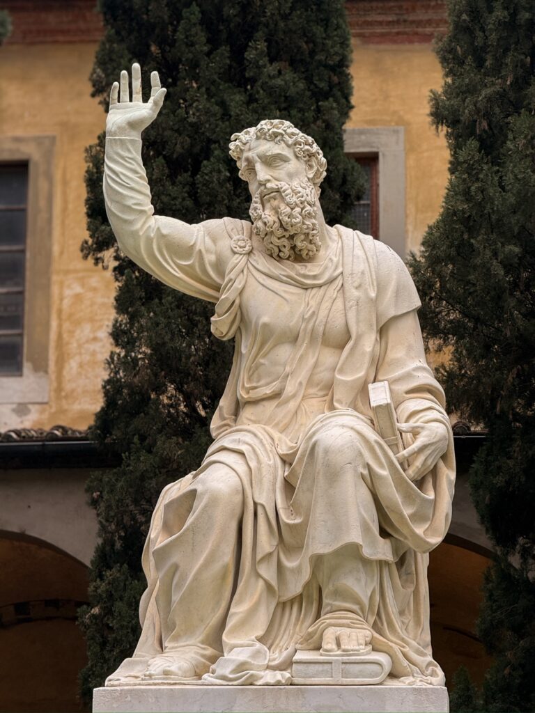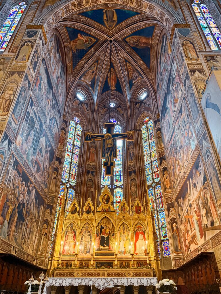 It was still early for the Duomo when we finished, so instead we walked a few more blocks over to the Basilica of Santa Croce which was just opening up. This large complex is located along the river in what was once marshland beyond the city walls. It is the burial place of many famous Renaissance figures, including Michelangelo, Galileo, and Machiavelli. It is also the largest Franciscan church in the world. Beyond the church, we were able to explore chapels, museum exhibits, the cloisters, and gardens. One exhibit showed the history of frequent flooding throughout the churche’s history, often reaching well over 12 feet and damaging or destroying the precious art inside. In the most recent round of flooding in the 1960s before modern river controls were put in place, many pieces of art were taken up the hill to near Boboli garden to dry out and be restored.