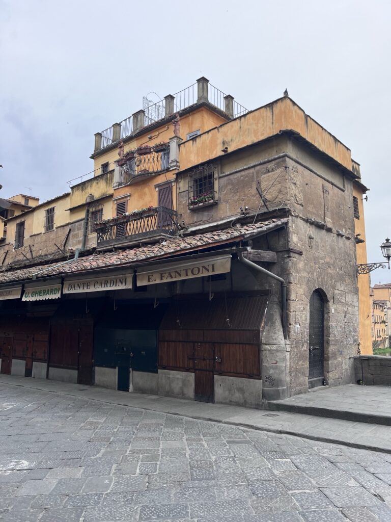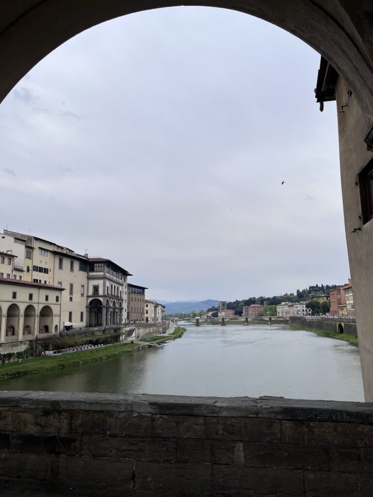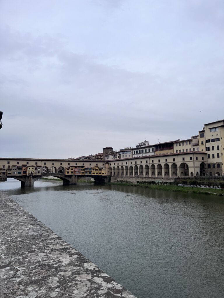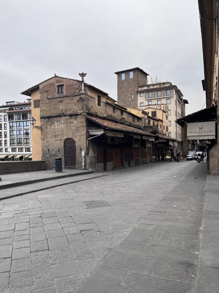 Since our Air BnB was located just up the hill from the bridge Ponte Vecchio, we started our day by crossing it into the center of Florence. The only bridge across the river not destroyed in WWII, it is known for the shops lining it which now house jewelers, art dealers, and souvenir sellers. Before 8am, the shops were just barely starting to open and the majority of people on the bridge were locals hurrying across. We took a few photos and continued onward.