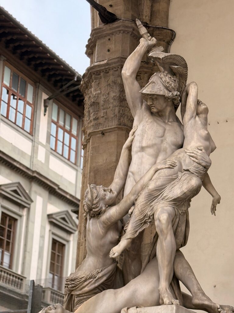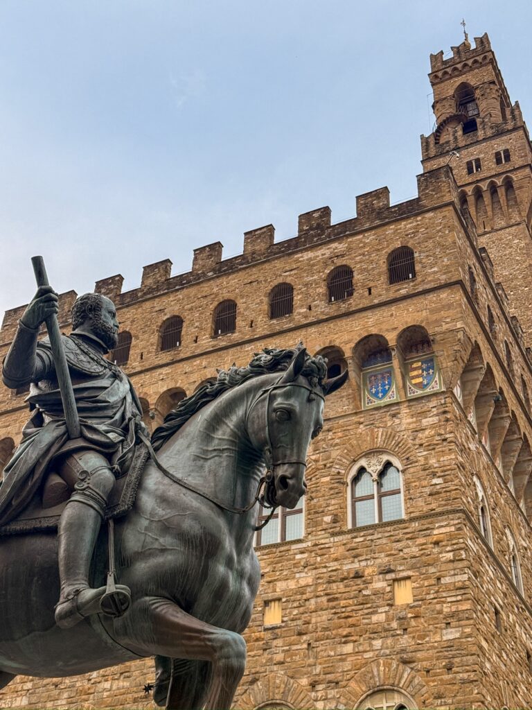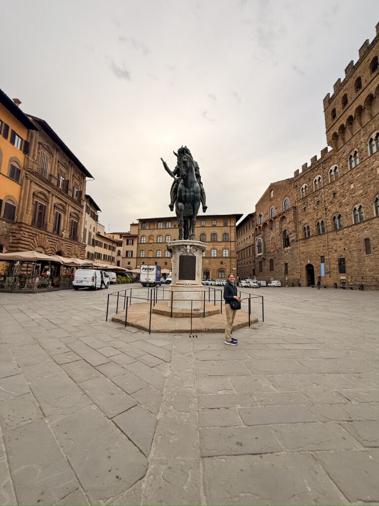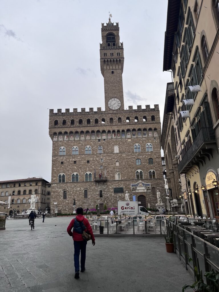 Our first stop was Piazza Della Signoria, the site of Palazzo Vecchio and original location of the statue of David. It also has a statue of Neptune and an open-air sculpture gallery. Later in the day we would pass through to find it packed with tour groups, but early in the morning our biggest concern was dodging trucks supplying the surrounding restaurants and the occasional motorbike zipping through.