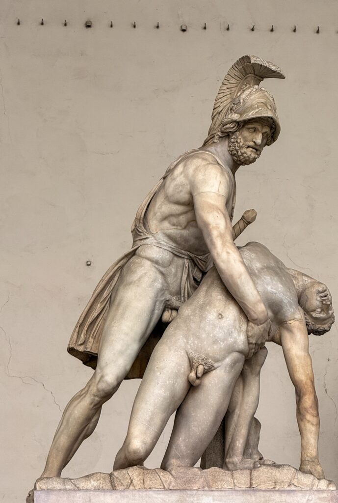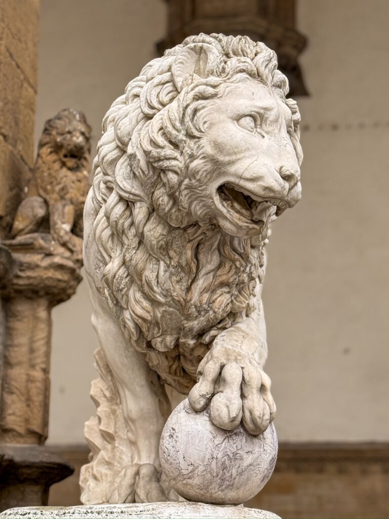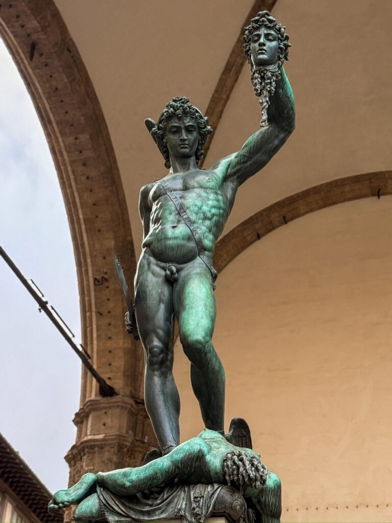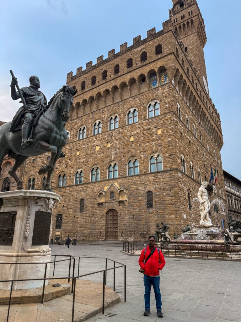 Our first stop was Piazza Della Signoria, the site of Palazzo Vecchio and original location of the statue of David. It also has a statue of Neptune and an open-air sculpture gallery. Later in the day we would pass through to find it packed with tour groups, but early in the morning our biggest concern was dodging trucks supplying the surrounding restaurants and the occasional motorbike zipping through.