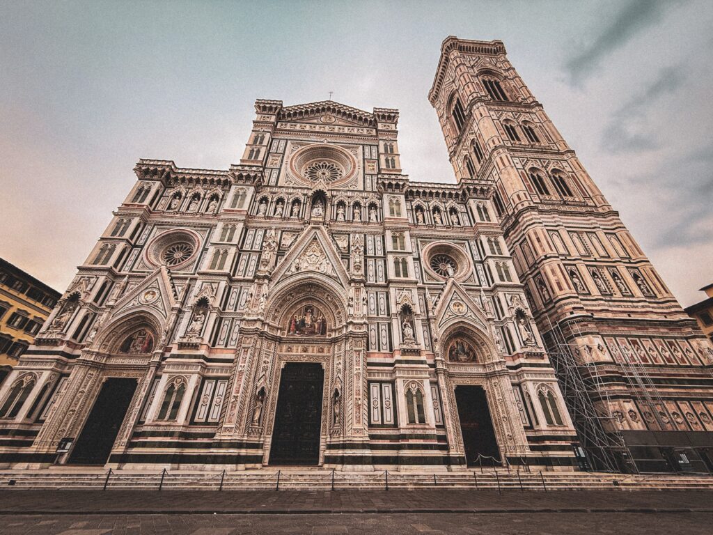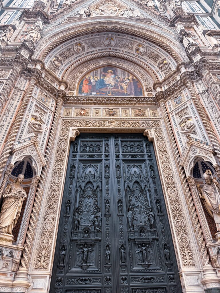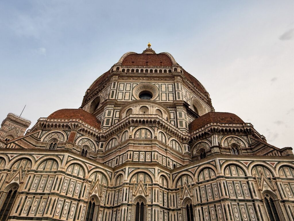 It was a short walk from there to the Duomo, the towering beheameth that dominates the center of the old city. Construction of the building started in 1296, the dome proved an enormous engineering challenge as it was too large for construction methods available at the time. The plagues further challenged availability of people and resources to complete the project. Finally in the 1400s Brunelleschi devised a system capable of supporting the dome through the construction process. It was finally finished in 1461, 15 years after Brunelleschi’s death.