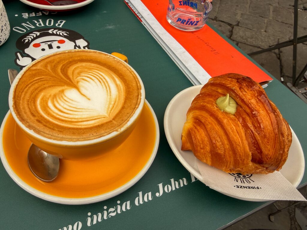 Entry to the main part of the Duomo is free but access doesn’t start until 10:15am, so it was still fairly quiet for taking pictures and getting a good look at the exterior. We then went a few blocks away and found a coffee shop to a enjoy a cornetto and coffee in a quiet piazza while we waited for the churches to open. I was suprised when the barista asked if we wanted a normal or large cappuccino, and the large was a full 12oz instead of the usual 6-8oz size.