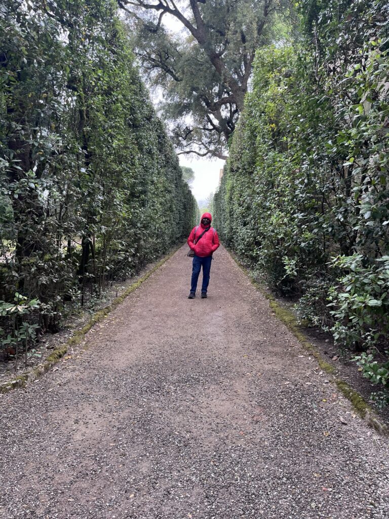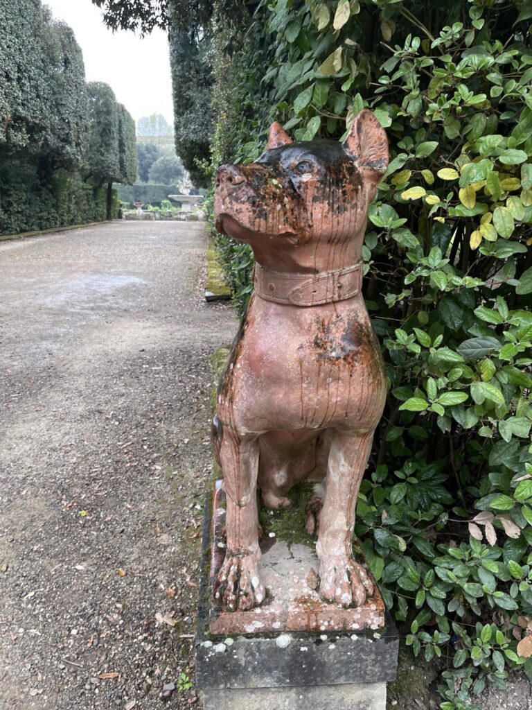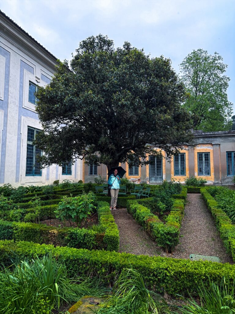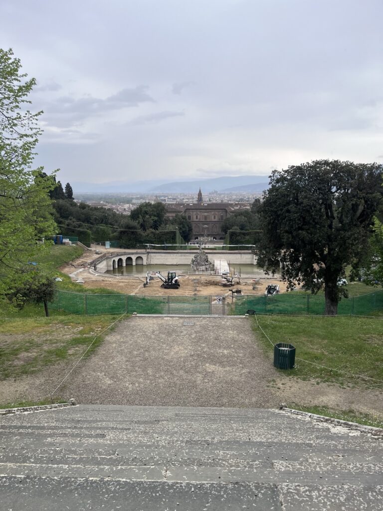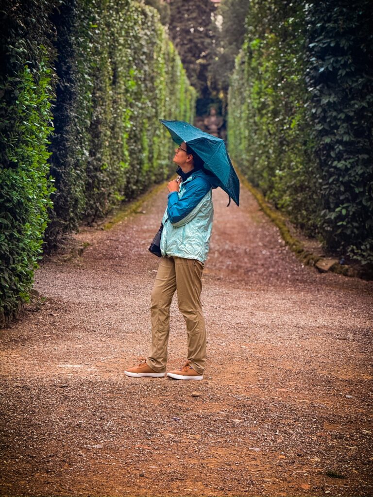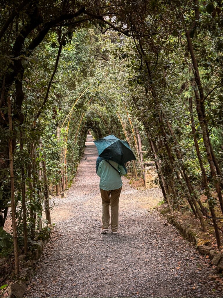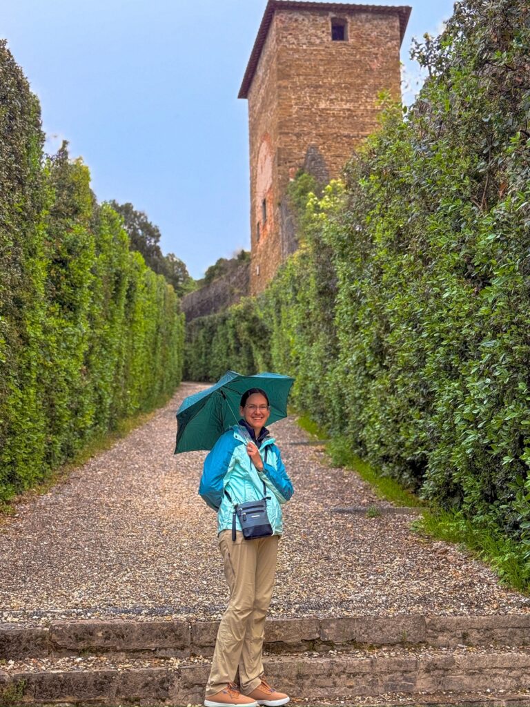 Our reservation for the larger Boboli Gardens was at 4pm in the afternoon. Rain was in the forecast, so we grabbed our rain jackets and umbrellas. Conveniently, there was a garden entrance just a 5 minute walk up the hill from us. As we passed through, the first drops of rain were starting to fall. Before long it was coming down steadily. Between the rain, many of the fountains being shut for repair, and a feeling that we were out of season for most flowers, it was a bit of a disappointing walk. We did enjoy the orangery and had fun taking photos in the hedges, which kept off some of the heaviest moments of rain.
