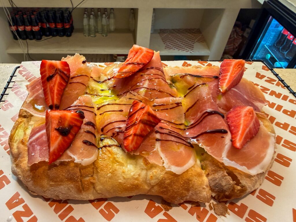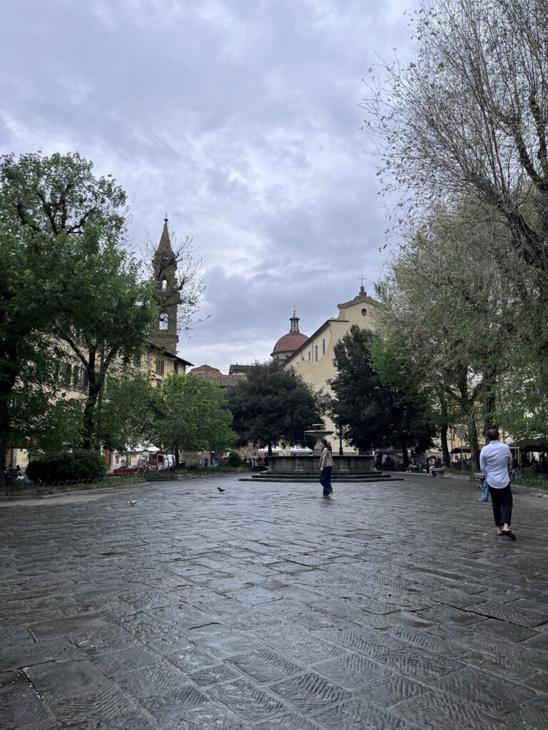 After we finished with the museum, we started to wander back toward the Air BnB for a break. We crossed the Ponte alla Carrara bridge and took a break in Piazza del Carmine. Away from the majority of the tourists, we watched people walking their dogs and friends meeting up before lunch. Just as we were starting to look at options for our own lunch, it started to rain. We picked a pizza place close by and hurried over. We made it just in time before the rain really started coming down.