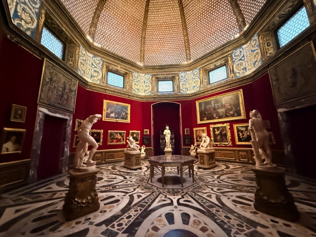 Arriving in the Uffizi courtyard, we found the line for entry stretching the entire length of the building. As usual, it was impossible to tell which part of the line was for which time slot or even if there was one or multiple lines. We simply joined one and hoped for the best. We were 15 minutes early for our appointment, and we reached the start of the official queue just a couple minutes after 4pm. The staff person at the start of the queue abruptly told everyone with 4pm tickets to line up against the wall, and there was a bit of a scramble as everyone adjusted their position. Finally we could see the signs marking the 3:45 and 4pm entry lines – there was no reasonable way to have figured out which line was correct earlier. In the end it all worked out, we made it through security and ticket check without any further problems.