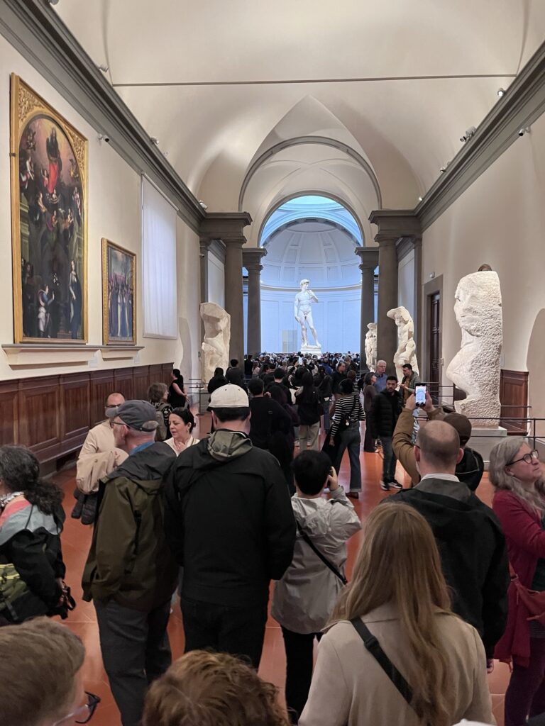 When we arrived at the Galleria dell’Academia a little before 8, a line was already forming. Since the museum staff hadn’t set out the guide lanes yet, it was basically just a mass of confused people trying to figure out where to go. Once they arrived, the museum staff did a very efficient job of moving people around and getting the lanes set up. Somehow we ended up only 6 or so people back in the lane for reserved tickets – it turns out most of the other people who arrived early were hoping to buy tickets on the day-of (not recommended since the quantity is limited and wait times get long).